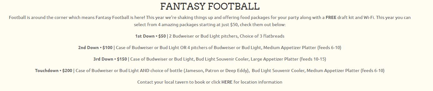 I think aside from everything else, I liked the prices the most. We ran a restaurant/bar before, and know first hand all the costs that get factored into the food and alcohol. We had a party of 10, and since it was draft day for Fantasy Football, we decided to go with one of their Fantasy Football specials as pictured below.