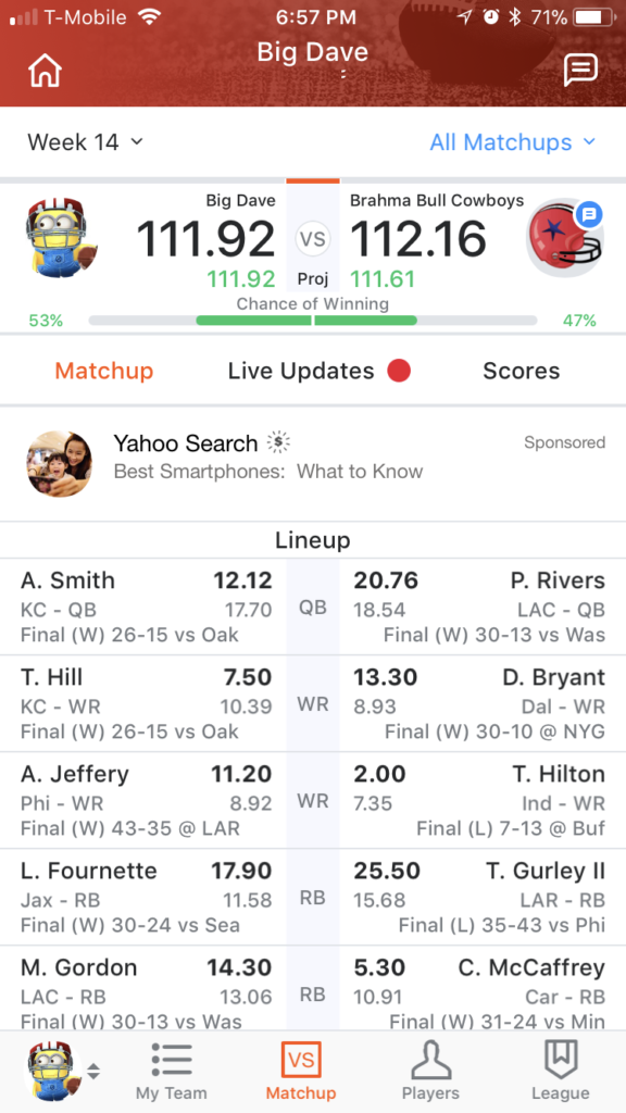 It can be a little confusing at first, but after a couple weeks, you will get used to it. Especially with the Fantasy App telling you in real time how many points each of your players are producing, in a head to head format against your opponent for the week. Its pretty funny when you watch a game with a buddy who lets say is a Dallas fan, and has his main players of his Fantasy roster are on the opposing team that day. They can’t root for either side!