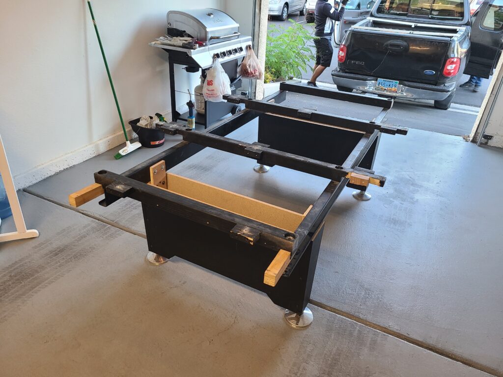 If you have never purchased a pool table before, this process is a form of Art. The 3 pieces of slate have to be evenly put on the frame, connected evenly, and then the felt has to installed, along with the bumpers, pockets……all in all it is a good 3 hour process with 3 people. Oh yeah, after all this, they have to make sure the table is perfectly level.