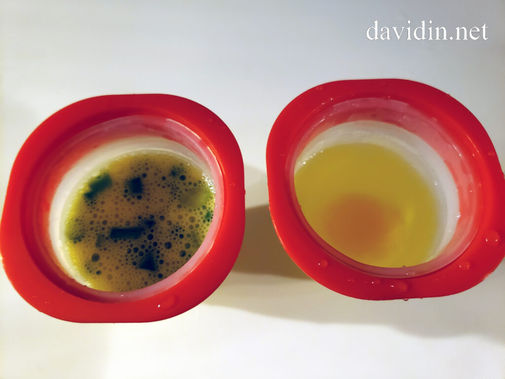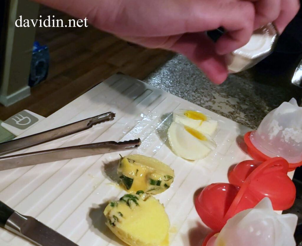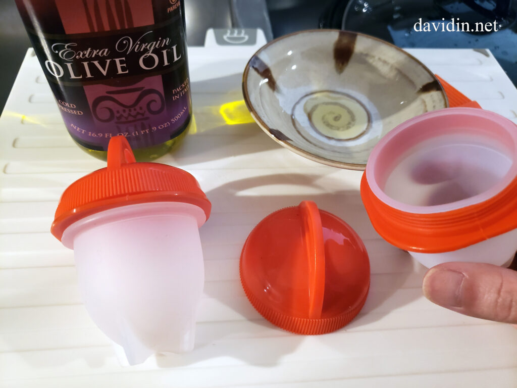 These egglettes are pretty much silicone capsules, with a twisting lid on top. One very important step is to always add some oil to the inside of the egglettes so that your egg doesnt’t stick. It is recommended to use PAM or a similar spray oil, however I am not a big fan of PAM, so I just used olive oil and a brush. On 1 egglette, I just cracked an egg directly into the egglette. For my second egglette, I got a little bit of chopped green onions, beat some some eggs, and mixed them together before pouring it into the egglette.
